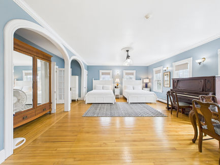 Kathryn Sullivan is a spacious first-floor studio suite in Dodge Cottage, offering two queen beds, one queen pullout sofa, and a kitchen. Located on the front side of the building, this suite blends comfort with functionality. Note: the tub is not full-size. Experience Dodge Cottage's warmth and Block Island charm in this inviting retreat.